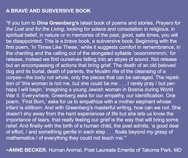 If you turn to Dina Greenberg’s latest book of poems and stories, Prayers for the Lost and for the Living, looking for solace and consolation in religious, in spiritual belief, in nature or in memories of the past, good, safe times, you will be disappointed...